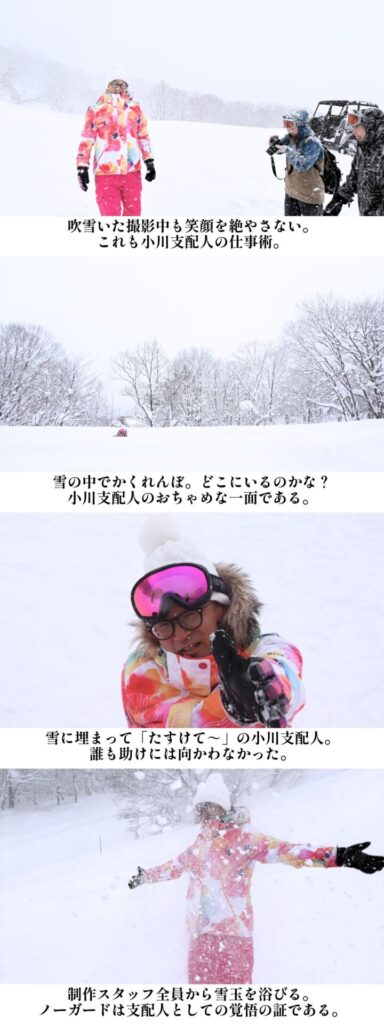 小川支配人:なるほど…確かにキレイな広告ですね。妙高高原の雪質や積雪量が伝わってきます。六十肩のボクには出来ないポーズですし...。