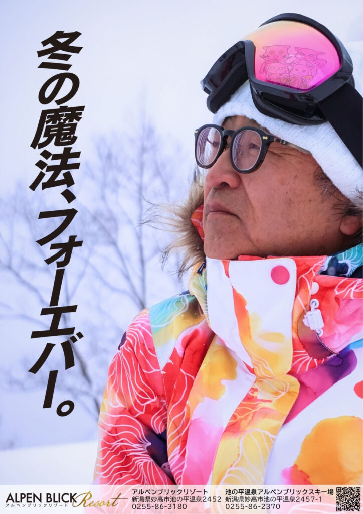 昨シーズンはJapan Ski Resort Poster Award 2024-2025において見事2位を獲得し、業界内外から注目?を集めたALPEN BLICK Resort支配人の小川 明(62)がモデルとなった広告キャンペーン。