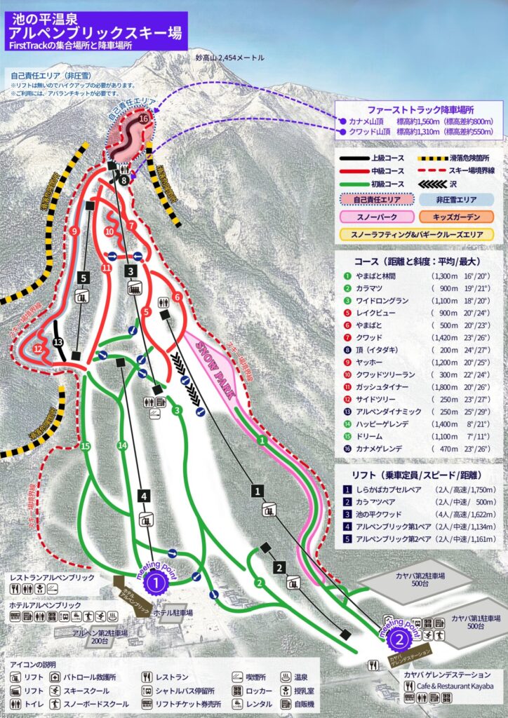 ※カナメ山頂から続くカナメゲレンデは、非圧雪の自己責任エリアとなります。ご参加の方はアバランチキット(ビーコン、プローブ、ショベル)の携行が必須となりますのでご注意ください。